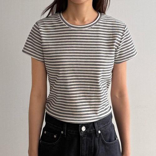엘케이트 여자 스트라이프 반팔티 슬림핏 세미크롭 티셔츠 LCR110