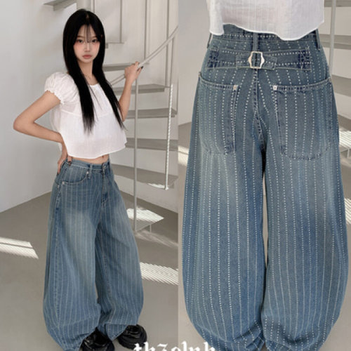 [신상오픈런]여성 스트라이프 루즈핏 비스판 발염 와이드 청바지