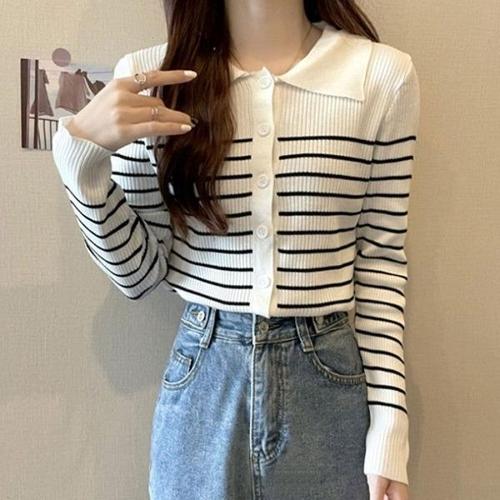 [엄지척]캐주얼 여성 가을 스트라이프 패턴 니트 가디건 자켓_19803944_667501