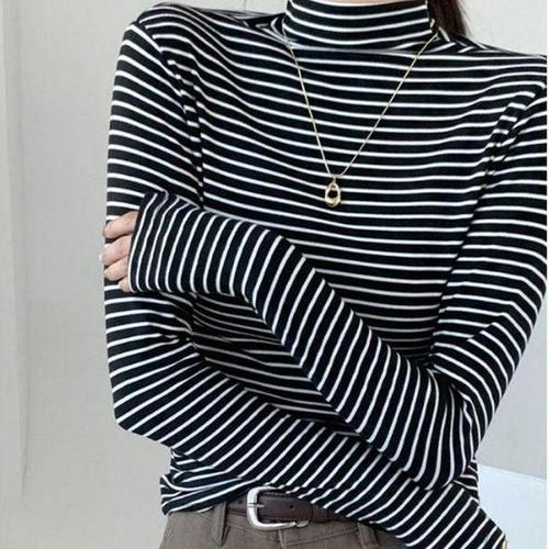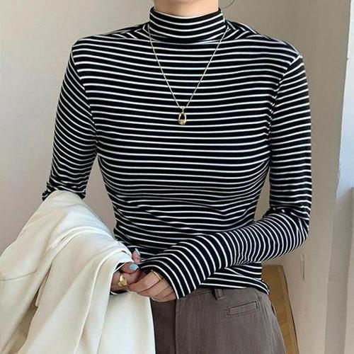 [셀러허브_여성트랜드패션]여성 하프넥 목폴라티 티셔츠 긴팔 목폴라 스트라이프
