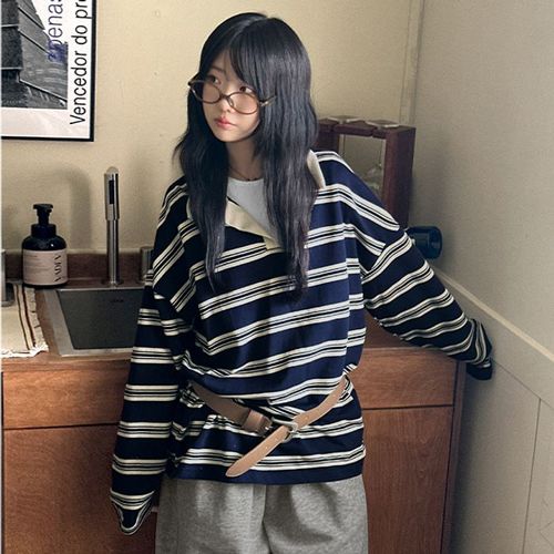 하이제시카 / PK카라 데일리템 딸기 반오픈 단가라 스트라이프 오버핏 긴팔티 맨투맨