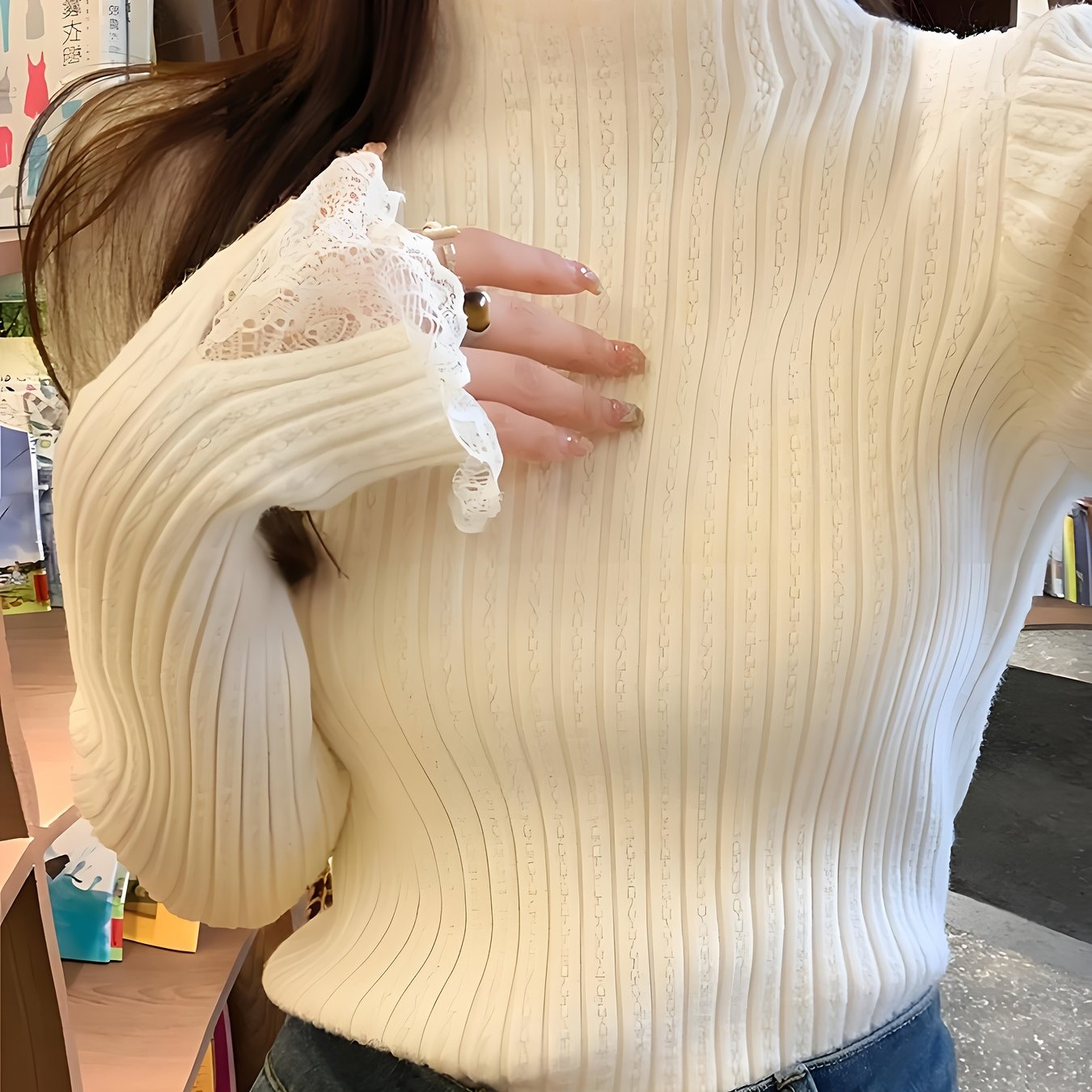 TEMU 우아한 레이스 디테일 풀오버, 봄, 가을, 겨울 레이어링에 적합; 실내외 겸용 다용도 하이넥 스웨터