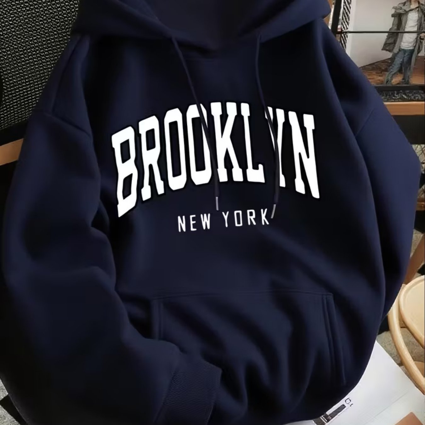 TEMU 남성용 브루클린 뉴욕 패턴 후드티 - 네이비 블루 후드티, 데일리 스트리트 스타일 및 캐주얼 복장을 위한 부드러운 폴리에스터 섬유