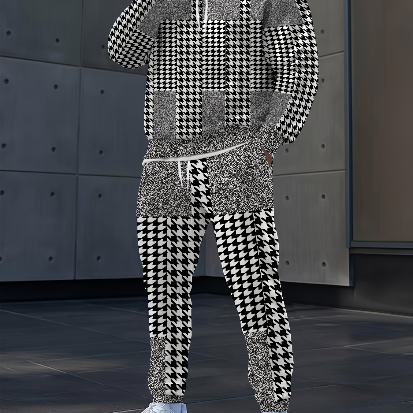 TEMU 하운드투스 프린트 후드티 & 조거 팬츠 세트 - 포켓이 있는 캐주얼 긴팔, 스트레치 원단, 세탁기 사용 가능 - 커플용 블랙 & 화이트 체크 무늬, 풀 프린트, 디지털 프린트, 후드 스웨트셔츠|커플룩