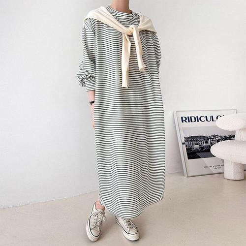 [문에이블]문에이블 여자 여성 가을 봄 간절기 루즈핏 스트라이프 단가라 베이직 스판 긴팔 롱 원피스