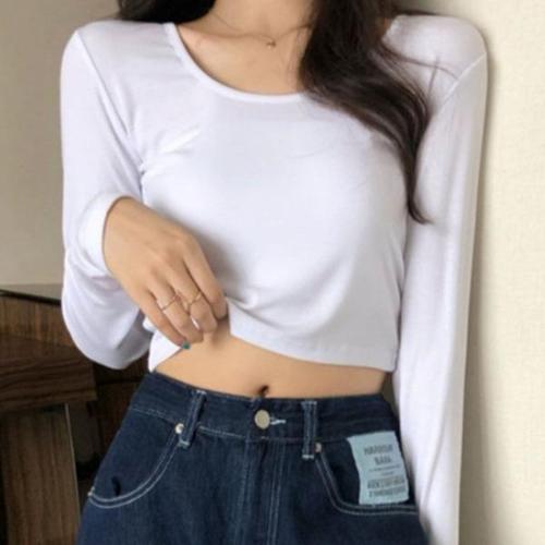 [엄지척]여자 댄스 대학생 라운드넥 긴팔 흰색 배꼽 크롭티_19613552_667501