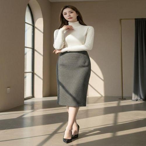 [다잇템]여자 일자 격자 겨울정장 울치마 슬릿 스커트