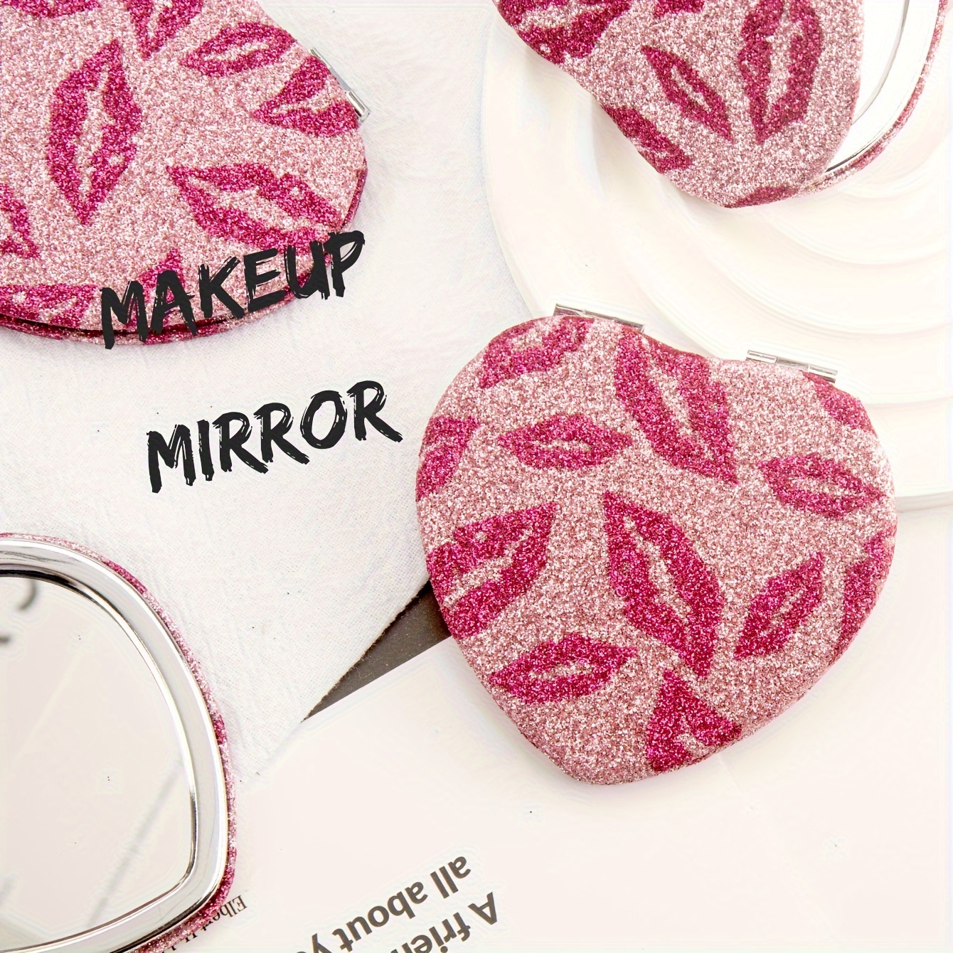 TEMU 섹시한 입술 패턴 글리터 하트 모양 휴대용 미러