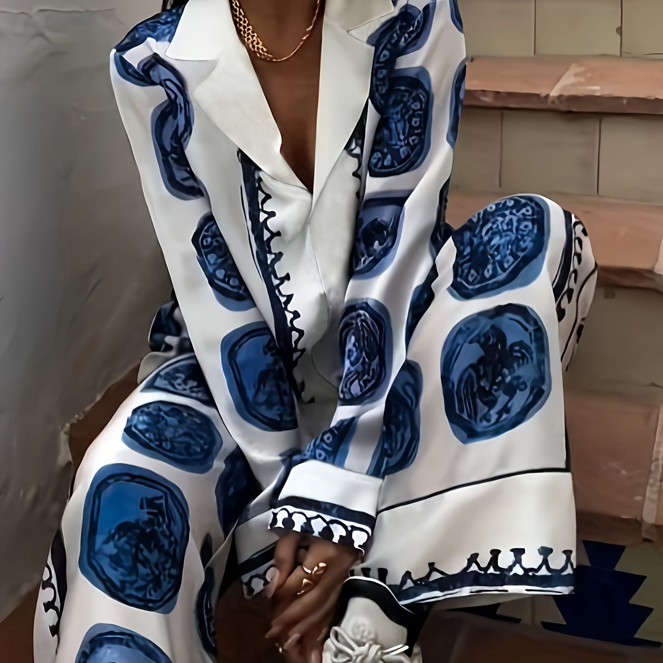 TEMU 블루 스타일리시 추상 프린트 투피스 팬츠 세트