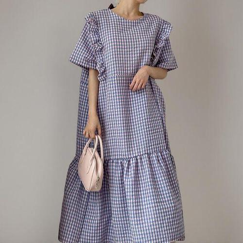 [옷자락]여성 러블리 프릴 대형 사이즈 시어서커 체크 롱 드레스