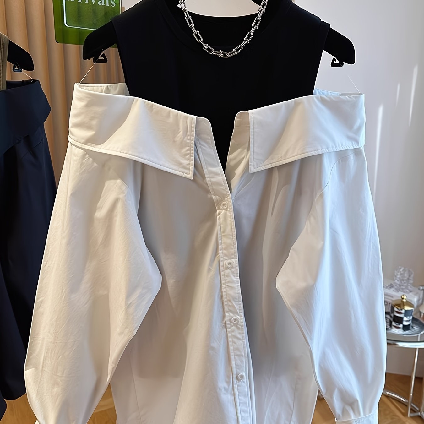 TEMU 2-in-1 오프숄더 블라우스 여성용 봄 웨어 루즈핏 고급 디자인 슬림 패치워크 셔츠 트렌디