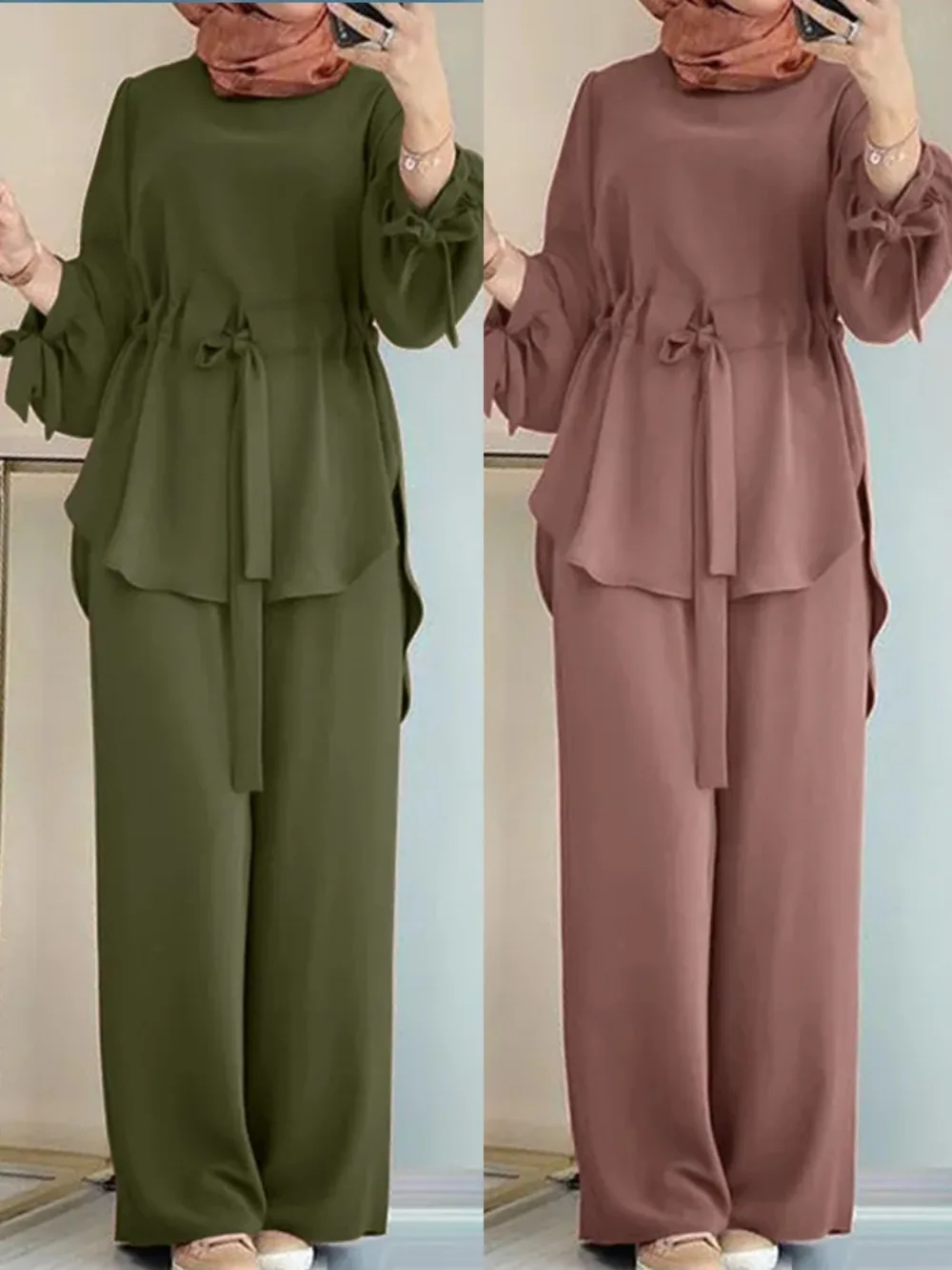 이드 무슬림 여성 의상 셔츠 새시 와이드 레그 팬츠 수트 라마단 모로코 두바이 이슬람 2피스 세트 아랍 잘라비야 모던 앙상블