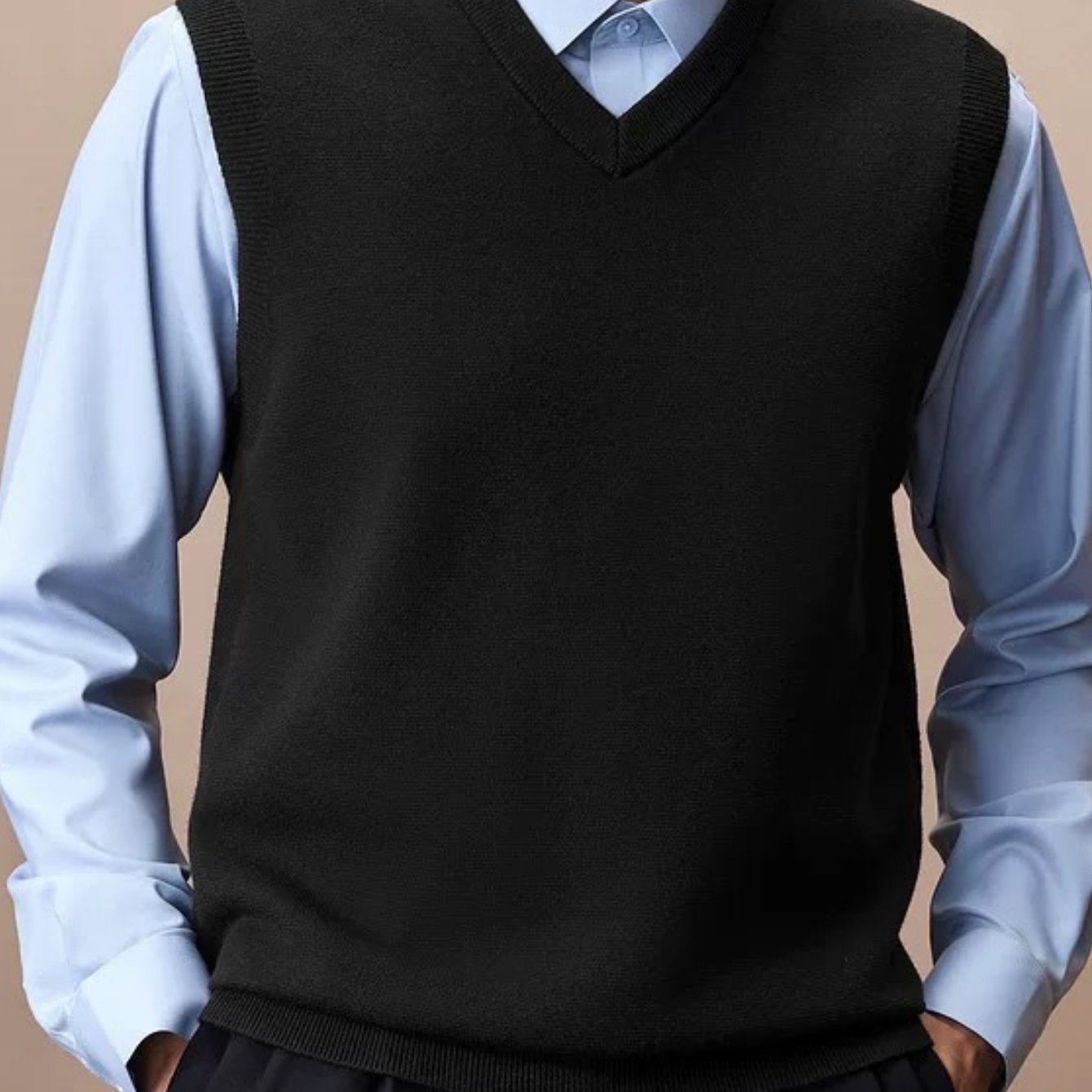 TEMU 남성용 블랙 V넥 니트 슬리브리스 카디건 - 캐주얼, 신축성 있는 원단, 정상 핏, 봄과 여름에 완벽, 캐주얼 웨어|V넥 카디건|신축성 있는 니트
