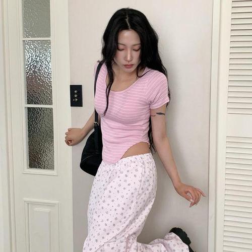 [신상오픈런]여자 면 세미크롭 스트라이프 스판 반팔티