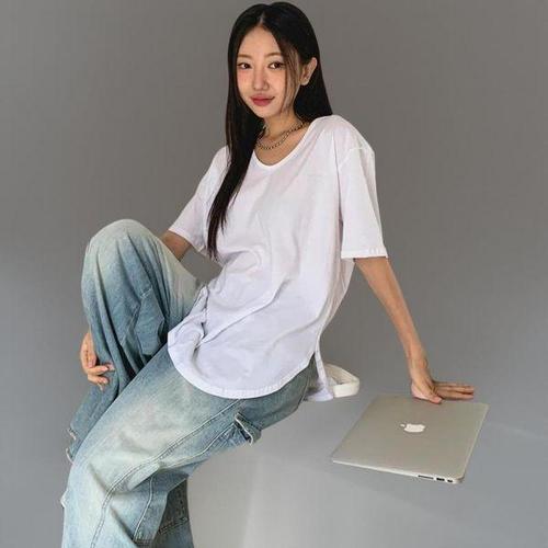 [신상오픈런]여성 언발란스 유넥 반팔티 힙무드 옆트임 코튼 티셔츠