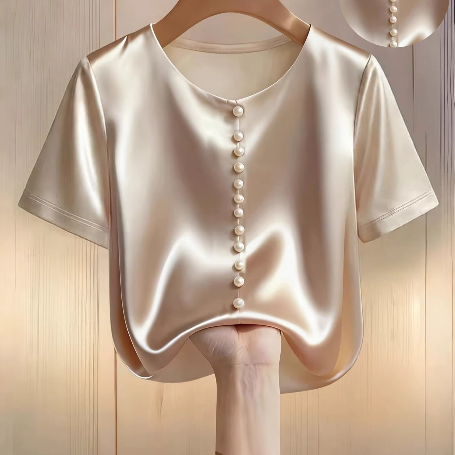 TEMU 우아한 새틴 반팔 티셔츠, 진주 장식, 출퇴근 및 외출에 완벽
