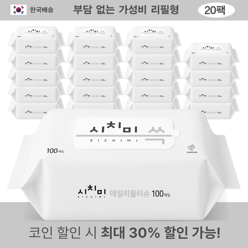 시치미 쓱 물티슈 대용량 리필형 두꺼운 휴대용 엠보싱 물티슈 100매 20팩