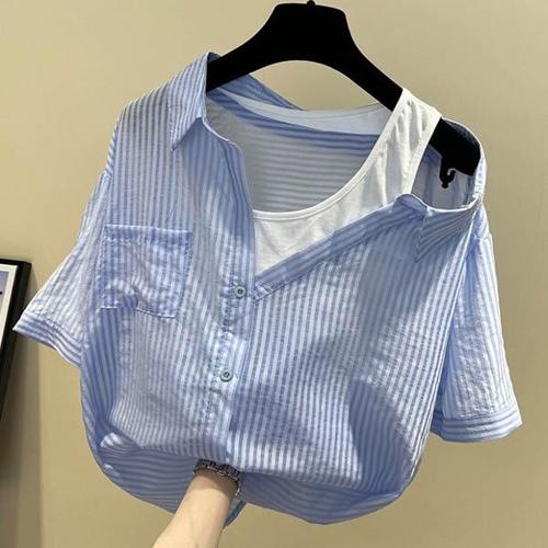 [유아몽드]크롭 반팔 여성 남방셔츠 스트라이프 루즈핏 세미크롭