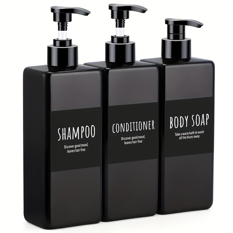 TEMU 3팩 스퀘어 병, 16.9oz 재사용 가능한 액체 디스펜서 병 (라벨 포함), 500ml 재사용 플라스틱 스퀴즈 펌프 병 (샴푸 및 컨디셔너용), 욕실, 주방, 호텔, 블랙, 여행용