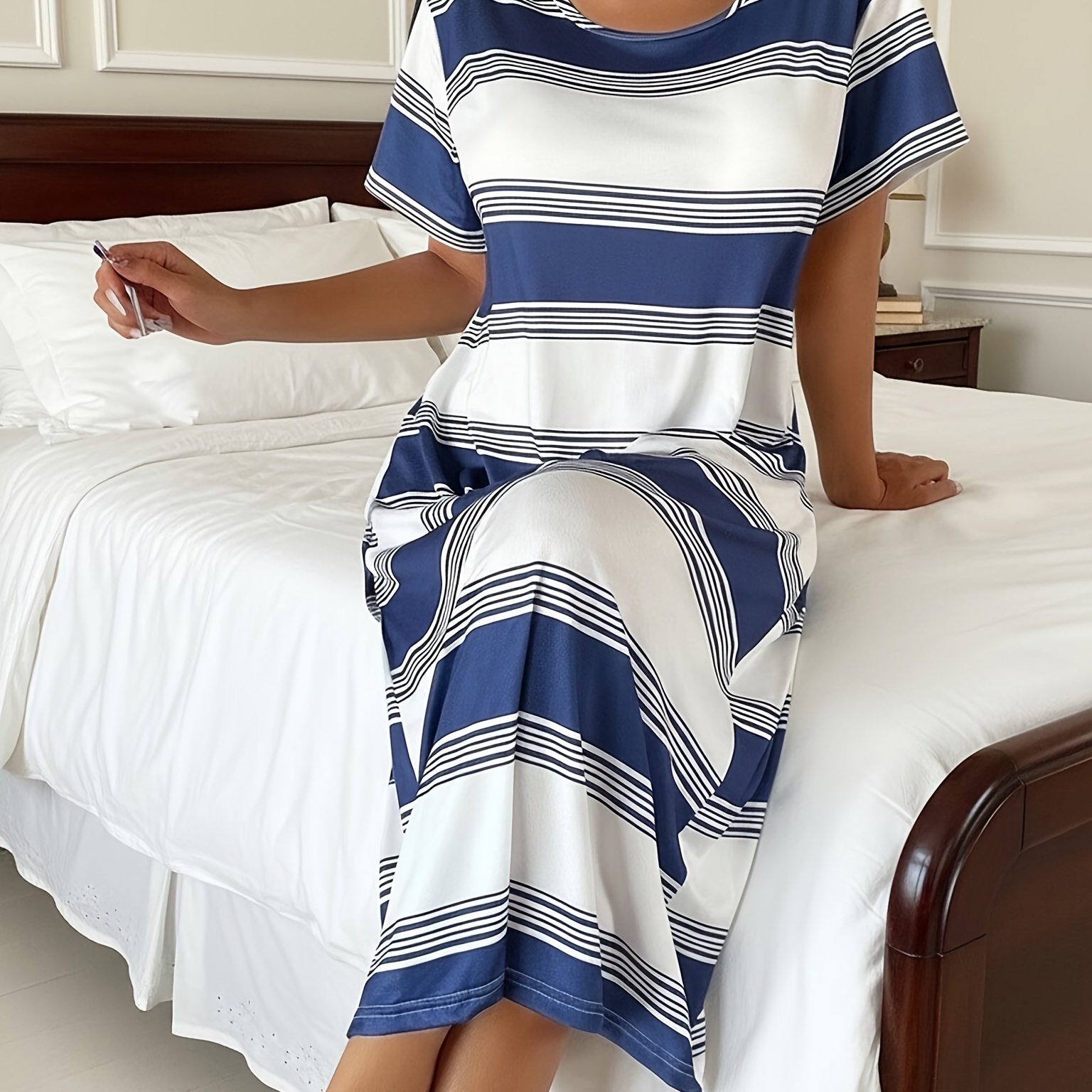 TEMU 여성 캐주얼 블루 & 화이트 프린트 루즈 롱 티셔츠 나이트 드레스 | 크루넥, 올 시즌, 성인용