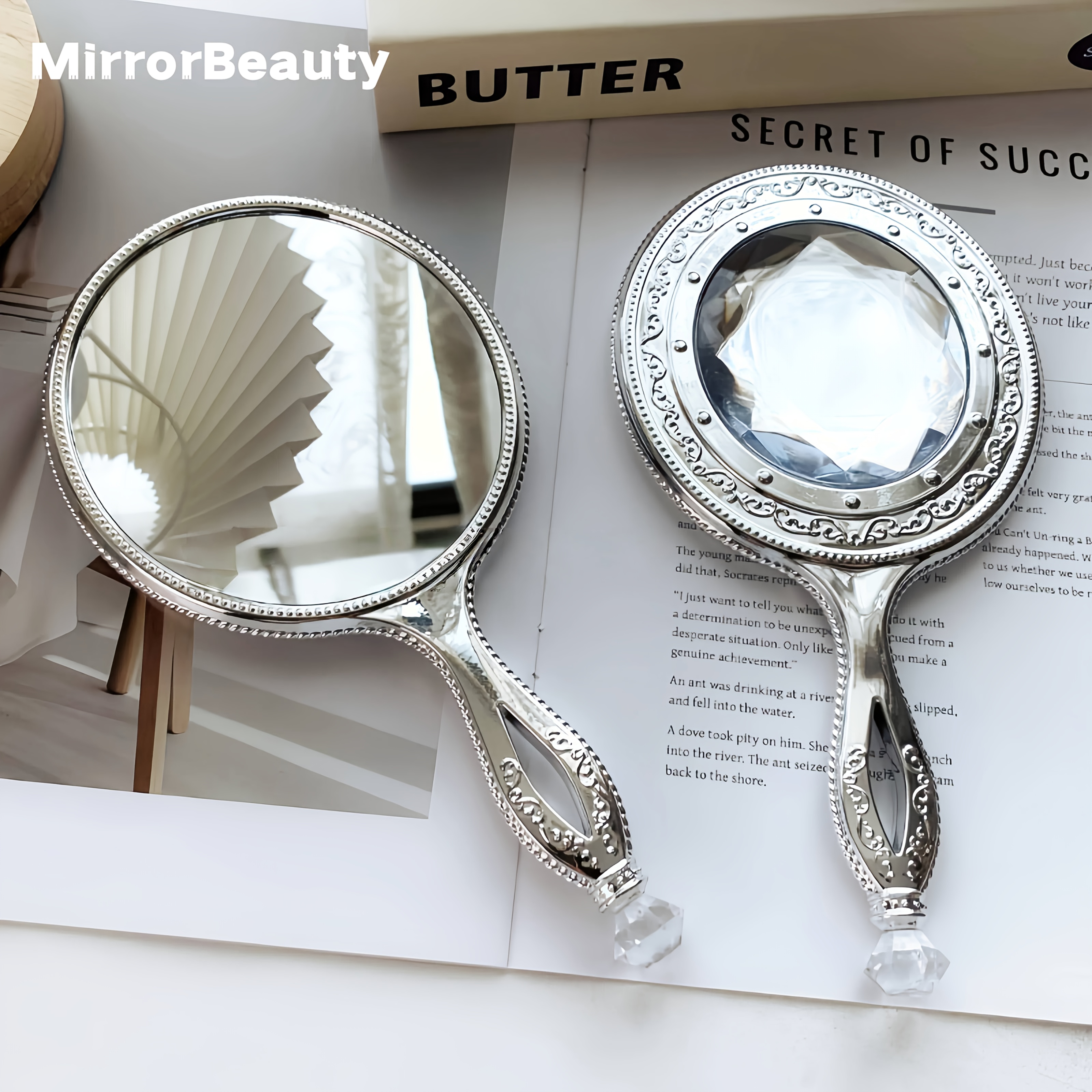 TEMU 1개 레트로 실버 메이크업 미러, 스톤 장식 핸드헬드 미러, 고화질 미러 표면, 집에서 메이크업 및 외출 시 터치업에 적합