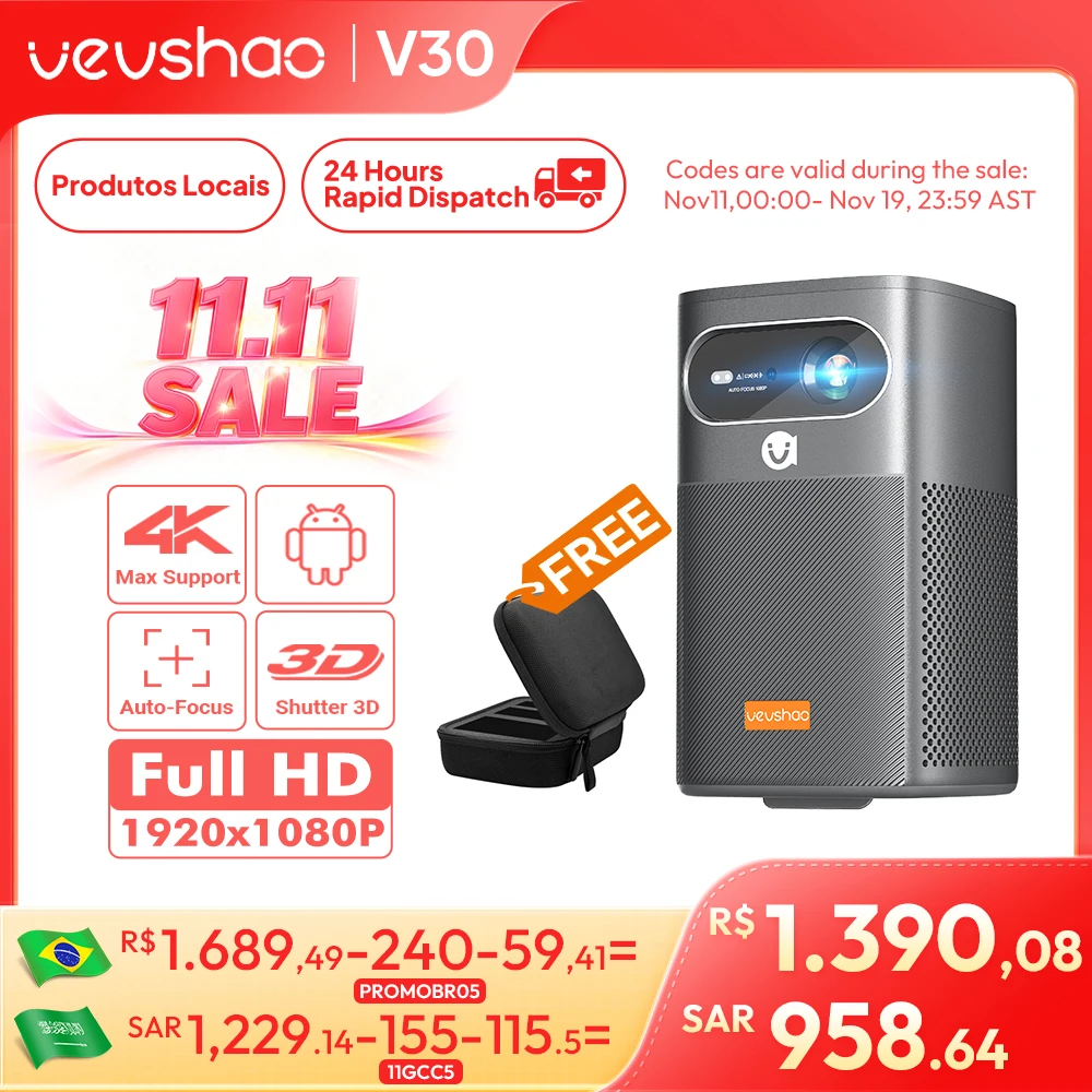 Vevshao V30 3D 미니 프로젝터 시네마 스마트 안드로이드 와이파이 휴대용 1080P 홈 시어터 비디오 LED DLP 프로젝터 배터리 포함
