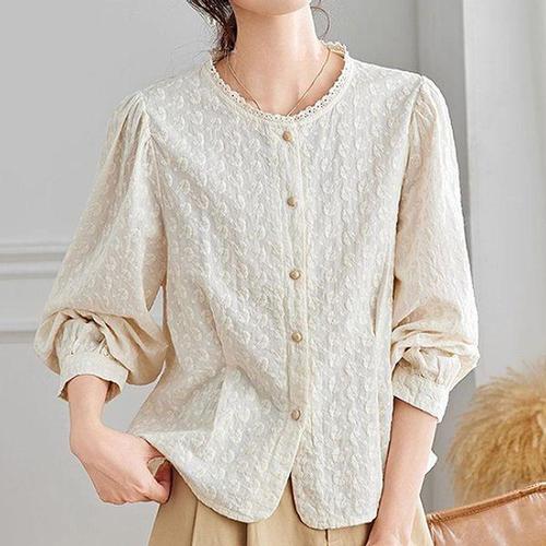 페미닌 v넥 레이스 셔츠 아일렛 얇은 블라우스 여성 펀칭 (WFKBXC3)