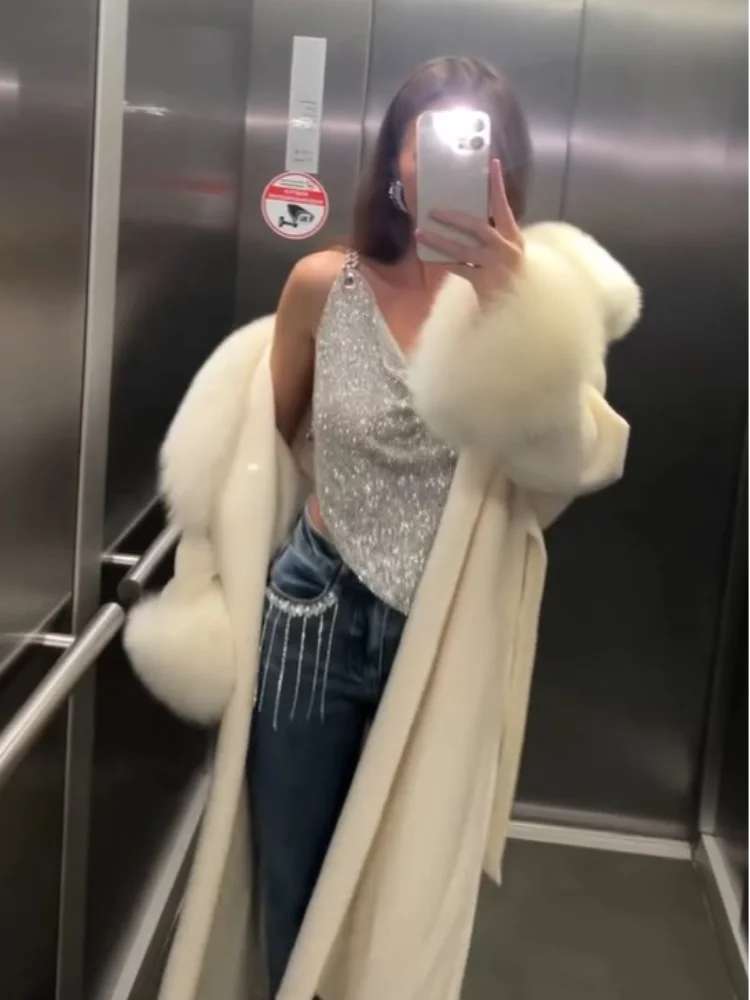 인조 모피 롱 플러시 여성 코트 우아한 레이스업 풀 슬리브 브이넥 여성 재킷 2025 겨울 패션 스플릿 루즈 여성 아우터웨어