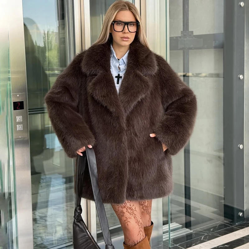 여성 캐주얼 라펠 인조 모피 롱 코트 루즈핏 솔리드 컬러 긴팔 퍼 재킷 여성 패션 겨울 따뜻한 스트리트웨어 코트