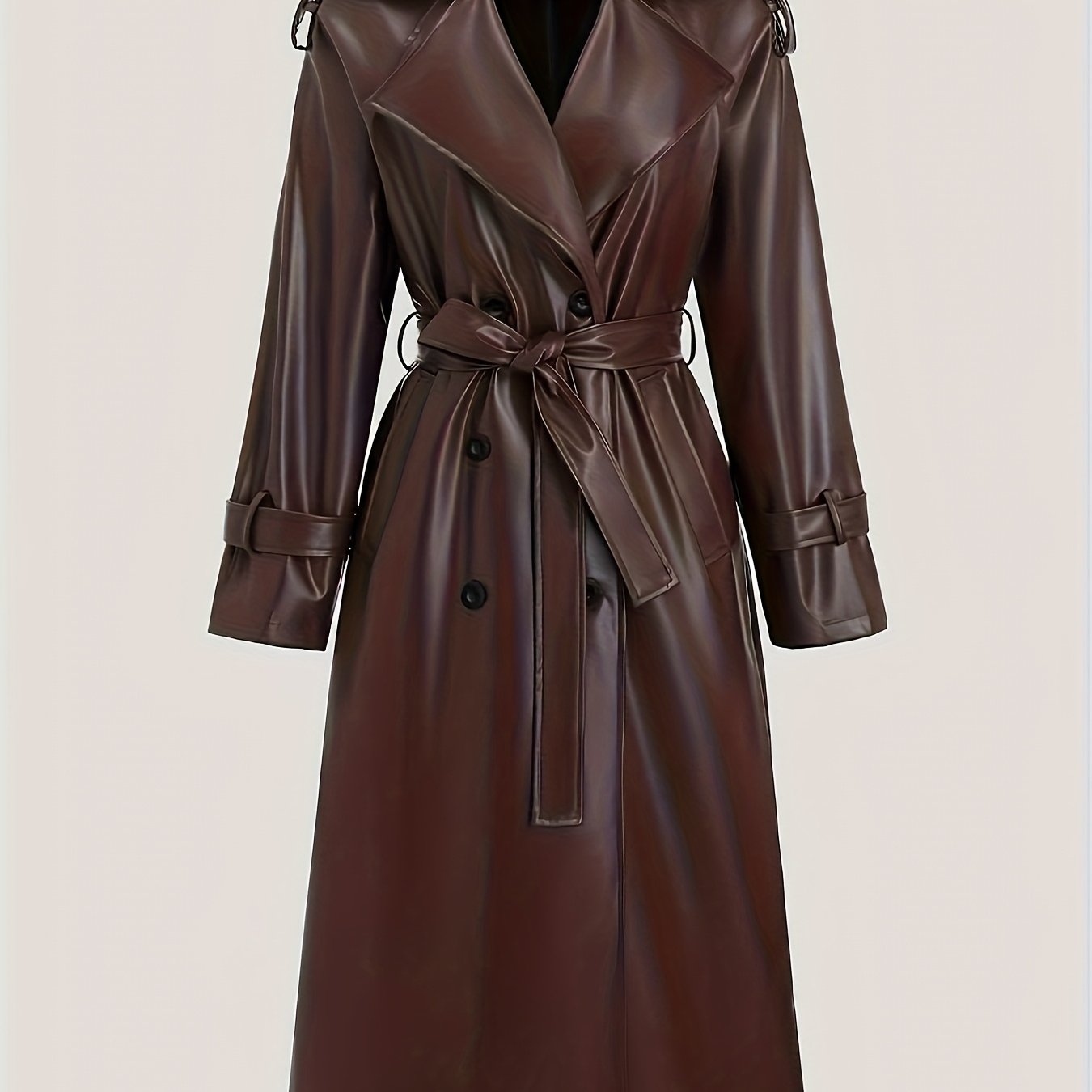 TEMU 여성용 PU 가죽 오버사이즈 롱 코트 - 우아한 칼라 더블브레스티드 재킷, 벨트 허리 & 포켓, 다크 브라운 트렌치 코트, 캐주얼 & 정장 이벤트용 (손세탁 가능한 PU 가죽 아우터웨어)