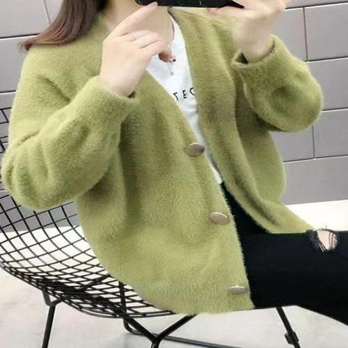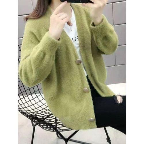 르위 브이넥 앙고라 퍼 니트 가디건 오버핏 여성용 점퍼