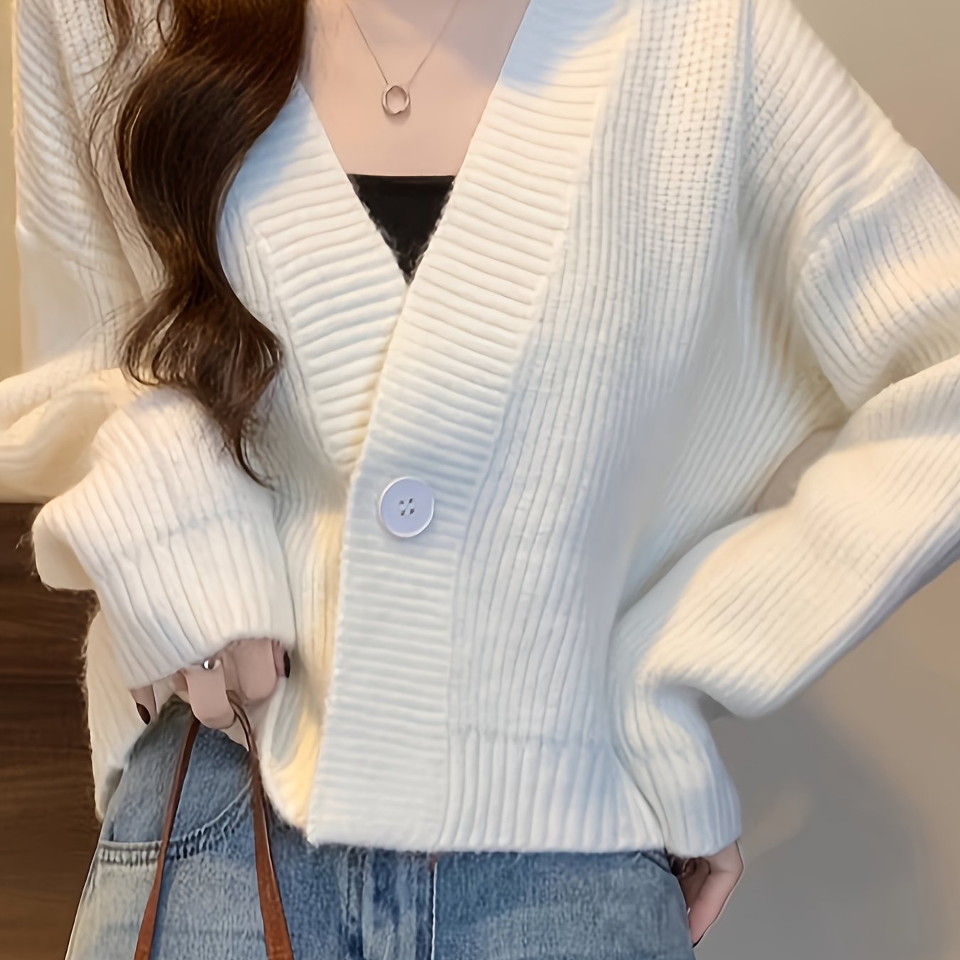 TEMU 여성용 한푸 스타일 루즈 슬림핏 V넥 롱소매 크롭 가디건 - 부드러운 스트레치 버튼 프론트 오프워크 디자인, 기계 세탁 가능 레이어링 아이템, 가을 겨울 캐주얼 웨어, 코지 의류, 에스테틱, 텍스처 니트웨어, 계절 전환 착용, 통기성 소재, 스타일리시 컴포트 스웨터