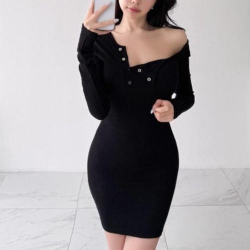 [옷자락]여성 슬림핏 골지 언발 단추 스트랩 미니 원피스