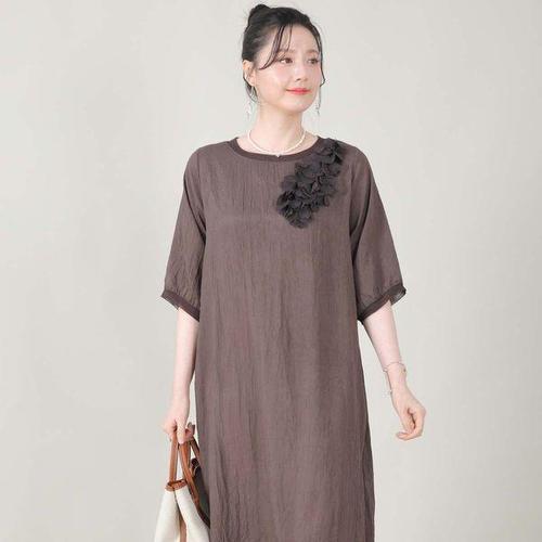 [애비뉴투지]엄마옷 꽃잎 코사지 하객룩 얇은 구김지 여름 5부 반팔 주머니 롱 원피스 K07530