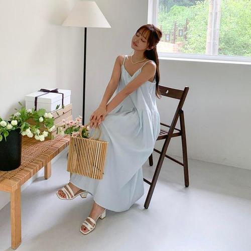 [옷자락]여자 썸머 핀턱 어깨끈 플레어 롱 원피스