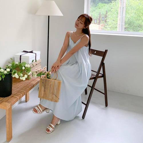 [옷자락] 여자 썸머 핀턱 어깨끈 플레어 롱 원피스