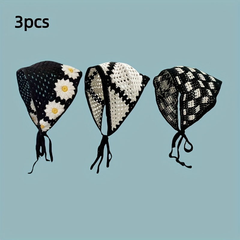 TEMU 3개 세트 크로셰 터번 헤어밴드 세트 - 스타일리시한 블랙 & 화이트 기하학 패턴과 꽃 장식, 여성용 조절 가능한 타이, 여행, 해변, 휴가에 완벽, 해변 액세서리| 스타일|폴리에스터 헤어밴드, 여성용 헤어 액세서리, 왕관, 헤어 액세서리, 헤어 클립, 헤드밴드