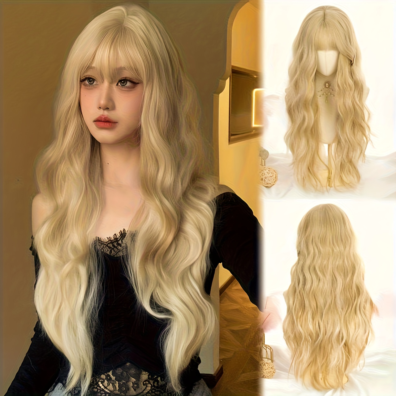 TEMU 28인치 블론드 웨이비 가발 - 앞머리 포함, 컬리 웨이브 텍스처, 내열성, 28인치 긴 길이, 파티, 일상 착용 및 크리스마스 공연용 - 모든 라이트 베이지 톤 및 인종에 적합