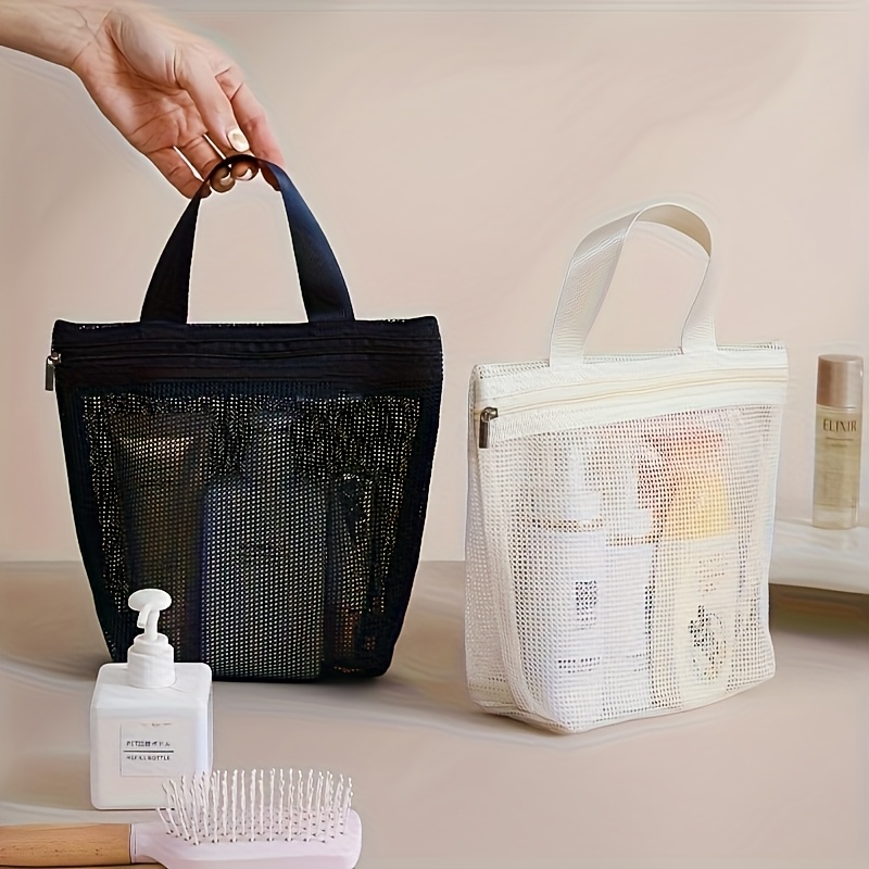 TEMU 지퍼 클로저가 있는 가벼운 메시 여행용 토트백 - 통기성 좋은 휴대용 세면도구 정리함, 해변, 수영, 헬스장에 적합, 핑크/베이지/블랙 캐주얼 스타일, 트렌디한 상단 손잡이, 여행 필수품, 수영용, 헬스장용, 해변용