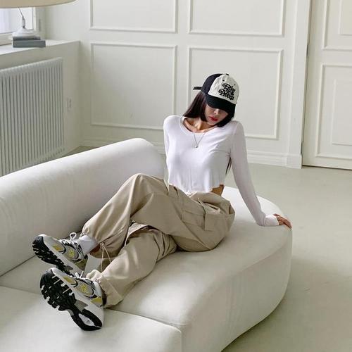 [다잇템]여자 크롭 라운딩 슬림핏 언더붑 긴팔티 (10961631A)