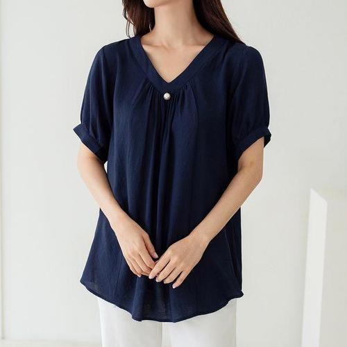 [드리다]여름 여자 셔링 진주 반팔 린넨 빅사이즈 루즈핏 블라우스 40-50대 중년여성 엄마옷 미시 마담 ..
