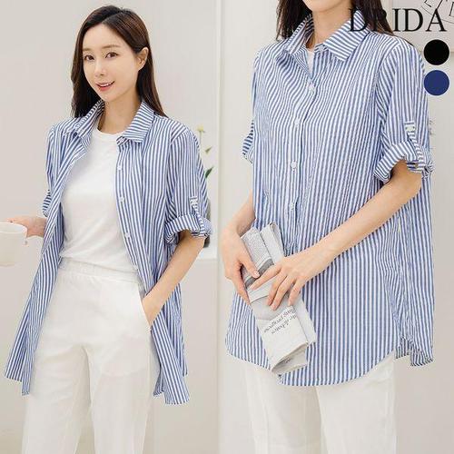 [드리다]여자 봄 여름 스트라이프 단가라 빅사이즈 박시 롱 오픈 셔츠 남방 40-50대 미시 중년여성 엄마..