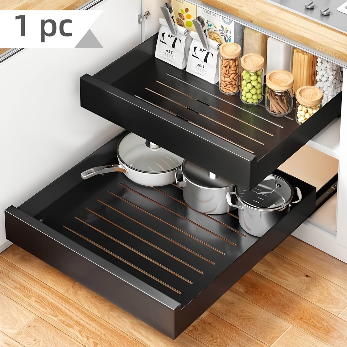 TEMU 확장 가능한 풀아웃 캐비닛 정리대, 12.6"-26.7" 헤비듀티 스토리지 랙, 냄비 및 항아리용, 드릴 없는 접착 마운트, 주방 필수품, 욕실 및 식료품 저장실에 이상적 - 슬림한 화이트 메탈, 서랍, 식기실