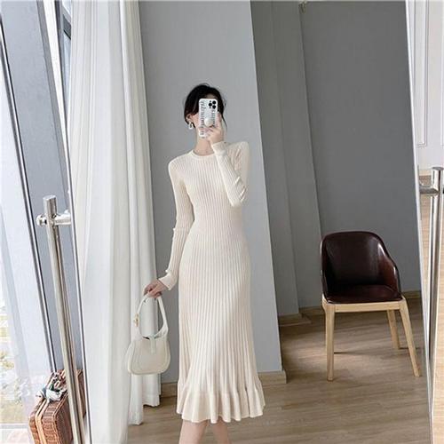 아이보리 골지 니트 롱원피스 플리츠밑단 데일리룩