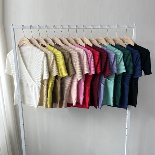 글램핏 / 페미닌 랩 슬림 브이넥 반팔 여름 골지 니트 티 14컬