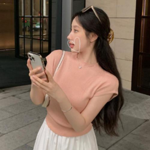 여성 반팔 백 스트랩 포인트 슬림핏 니트 탑 티셔츠 WFL77MU