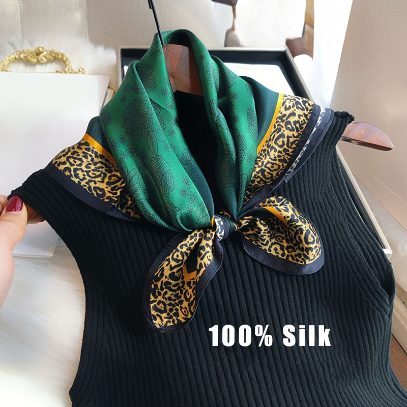 TEMU 100% 실크 스카프 | 우아한 유럽 스타일, 그린 플로럴 & 골드 프린트, 고급스럽고 , 다용도 및 통기성, 봄/여름에 이상적, 선물 및 외출용으로 완벽