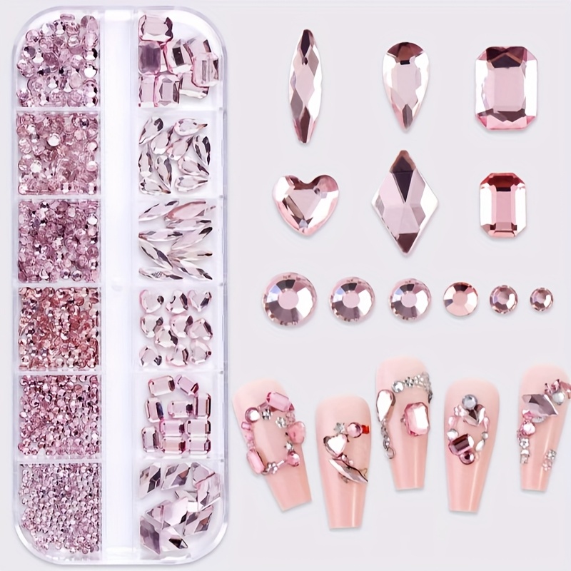 TEMU 1000개 네일 아트 12 그리드 특수 모양 라인스톤 네일 스티커 (무접착 바닥 혼합 소형 원형 납작 바닥) 주얼리 장식