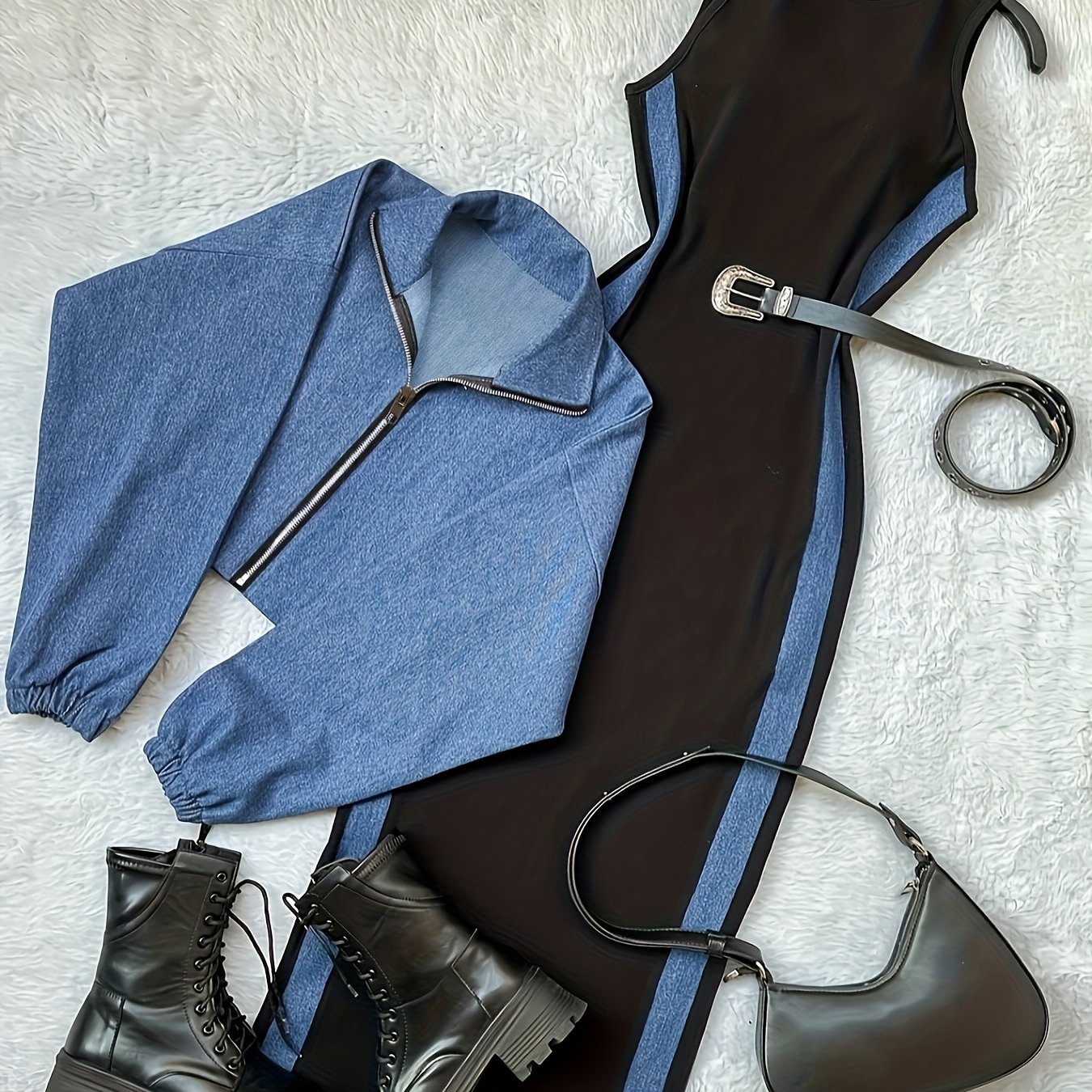 TEMU 여성용 블루 지퍼업 칼라 긴팔 재킷 & 컬러 블록 핏 슬리브리스 라운드넥 롱 드레스 투피스 세트
