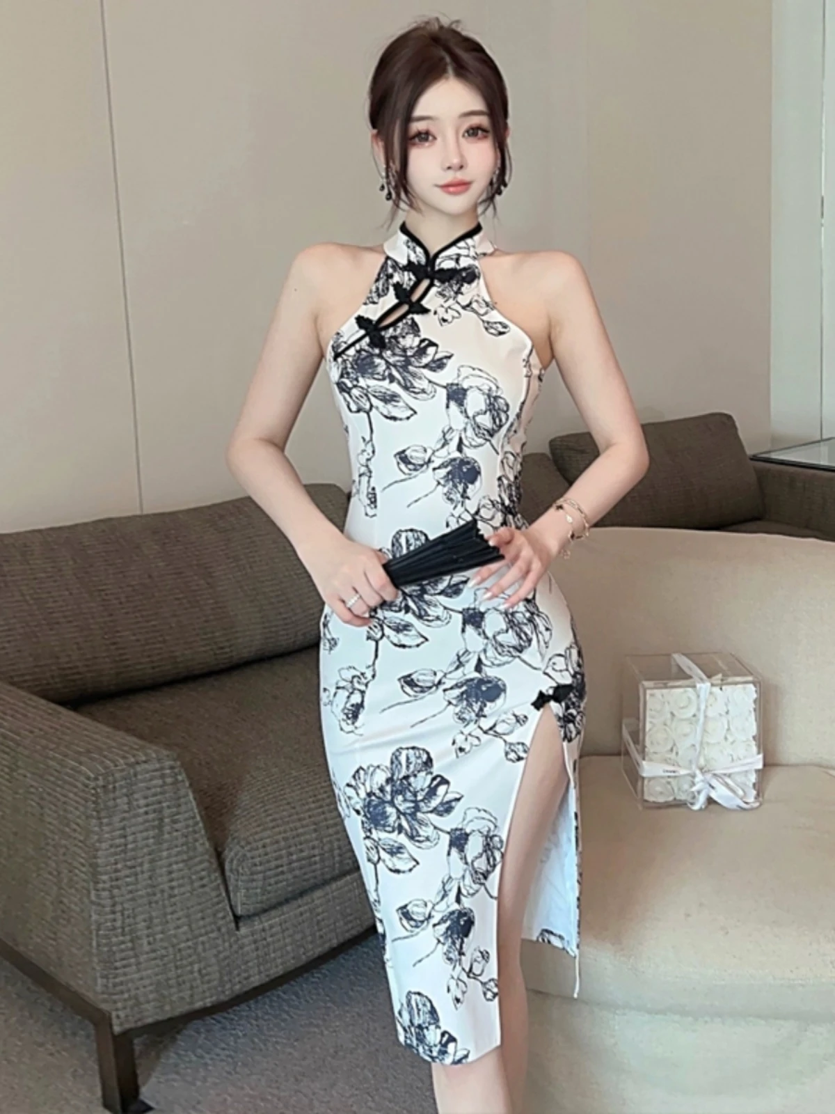 여성용 꽃 프린트 하이 슬릿 허벅지 홀터 드레스 - 여름 민소매 섹시한 바디콘 비치 파티 클럽웨어
